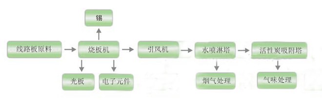 7.2工藝介紹: 采用電加熱或液化氣加熱,將內(nèi)部溫度開至120℃,錫將熔化,電子元件將隨著主機的運行從電路板中脫落。該機具有自動化、處理效率高、運行成本低、占地面積小、操作簡單、絕無粉塵污染等優(yōu)點。處理后的基板可以通過物理的方法回收銅和其它金屬,電子元件則可以進行環(huán)保無害化分類回收再生利用。該機是理想的電路板電子元件拆解設(shè)備。
