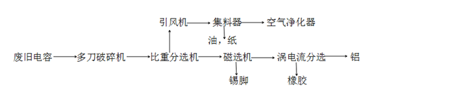 1.多刀破碎機(jī):把廢舊電容進(jìn)行破碎分解; 2.比重分選機(jī):把破碎后的電容進(jìn)行風(fēng)選和比重分選,把油紙分離出來,把鋁、橡膠、電子腳分離出來; 3.磁選機(jī):把比重分選后的物料進(jìn)行磁選,把電子腳磁選出來; 4.渦電流分選機(jī):把鋁和橡膠分離出來。